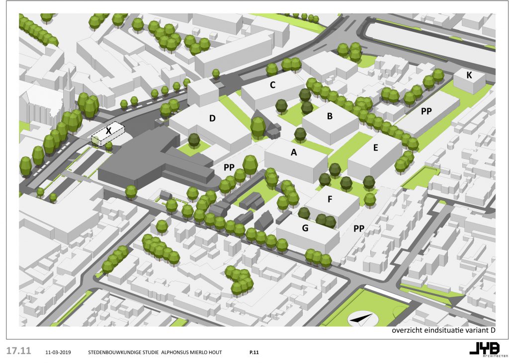 Eén van de scenario’s is als figuur bij dit artikel gevoegd. Dit scenario laat verschillende los in het groen geplaatste bouwblokken zien en een sterke verbinding tussen de Hoofdstraat met haar winkels, Kindcentrum, kerk, ontmoetingsplekken en het nu nog wat weggestopte hof van Alphonsus. Hoe de bouwblokken dan daadwerkelijk moeten worden geplaatst, is iets om nader uit te zoeken.