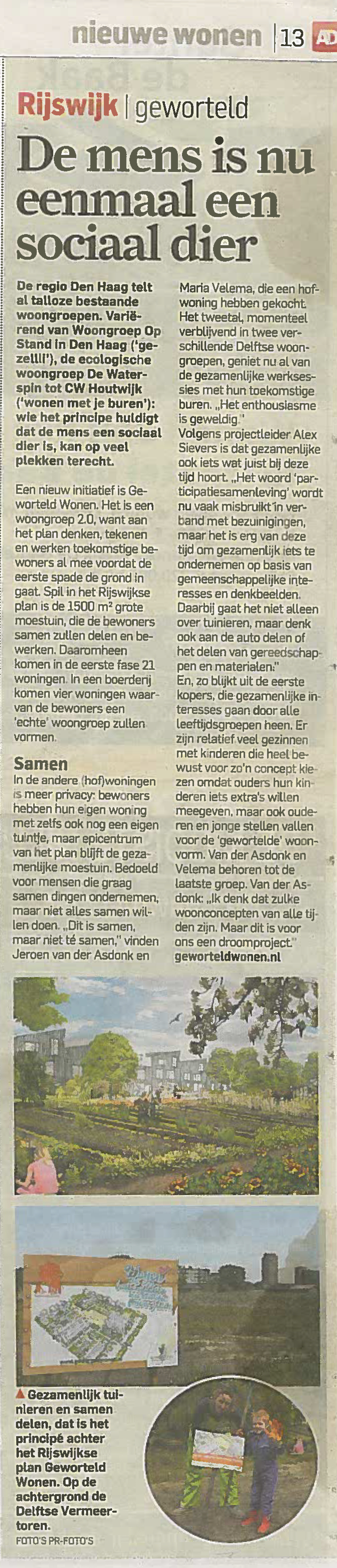 Eind mei besteedde het Algemeen Dagblad aandacht aan ons project Geworteld Wonen in Rijswijk. Geworteld Wonen is een sterk vraaggericht project alwaar we in co-creatie met de doelgroep duurzame huizen in een groene setting realiseren. Wonen met een moestuin op een modern landgoed, dat is waar wij samen met de toekomstige bewoners voor gaan. En het werkt goed om op deze manier te ontwikkelen. Meer dan 70% van de woningen is inmiddels afgezet. We denken dt een dergelijk project ook op andere plekken in de Randstad goed mogelijk is. Met eenzelfde enthousiasme als in Rijswijk. Belangstellend? Kijk ook op geworteldwonen.nl