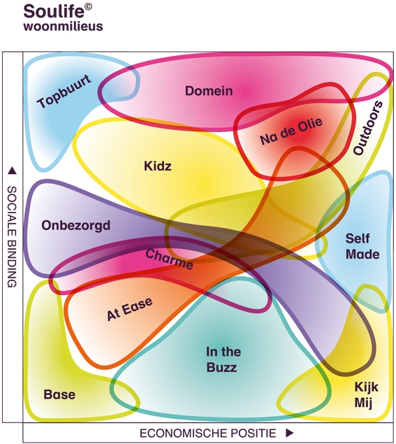 Woonmilieus combineren fysieke, sociale, economische en organisatorische kenmerken en vormen de spil in onze vertaalslag van vraag naar aanbod. Omdat wij bij al deze kernmerken een uitgebreid beeld hebben van wat de verschillende leefstijlen belangrijk vinden, kunnen wij een woonomgeving creëren die de doelgroep daadwerkelijk aanspreekt. In Soulife Woonmilieus onderscheiden wij twaalf woonmilieus op het vlak van economische positie en sociale binding van bewoners met hun woonomgeving. Deze variëren van recht toe recht aan uitbreidingswijken waar het prettig wonen is voor gezinnen tot hele specifieke woongebieden die bijvoorbeeld gebaseerd zijn op een gemeenschappelijke interesse van bewoners. Voor elk van de woonmilieus hebben wij zicht op aspecten als functiemix, sfeer en zeggenschap. Woonmilieus zijn ‘gevoelsgebieden’ en geen gebieden met harde grenzen. Mensen maken het woonmilieu en hiermee wordt tegelijk de relatie met onze leefstijlen gelegd.