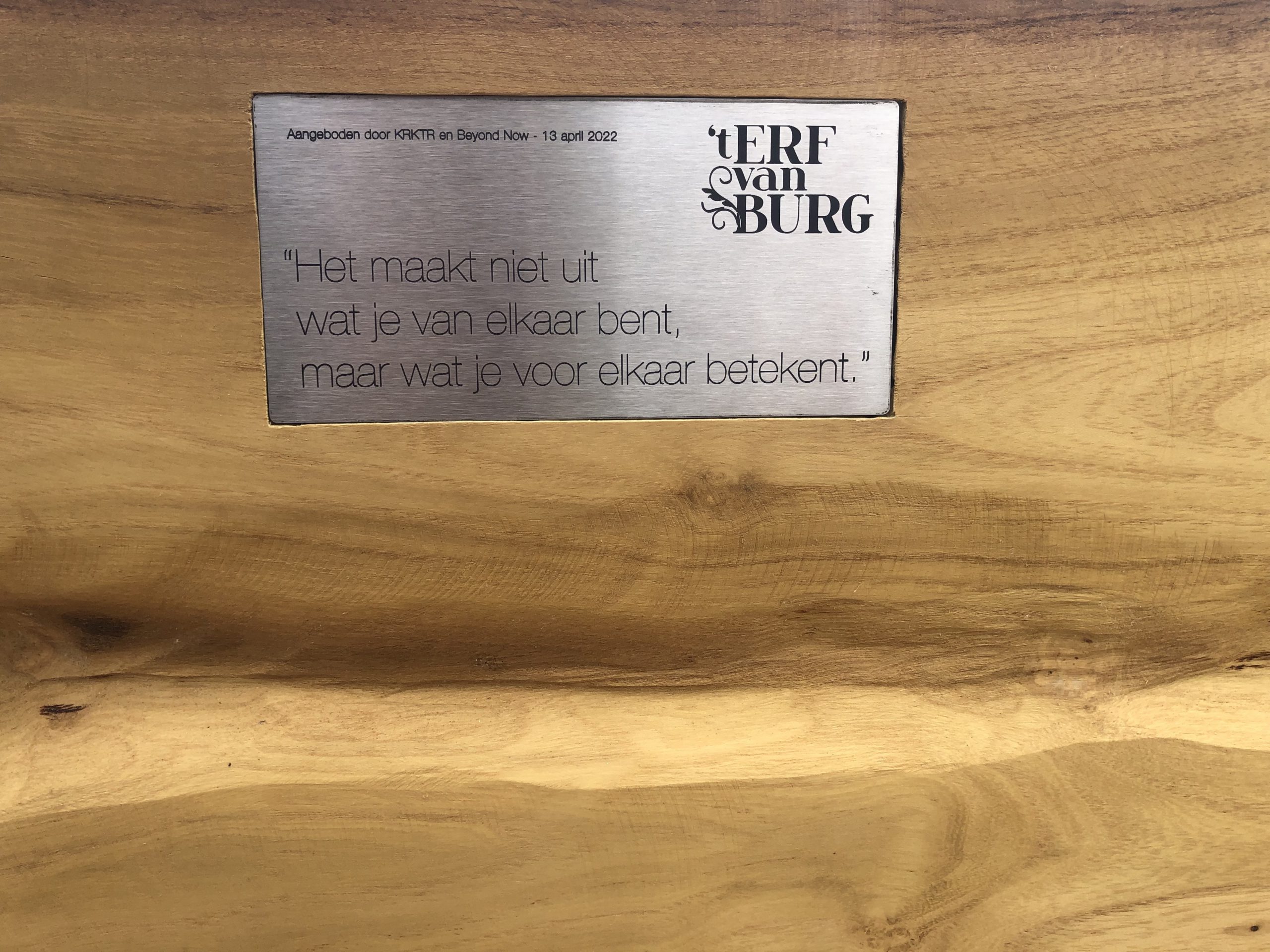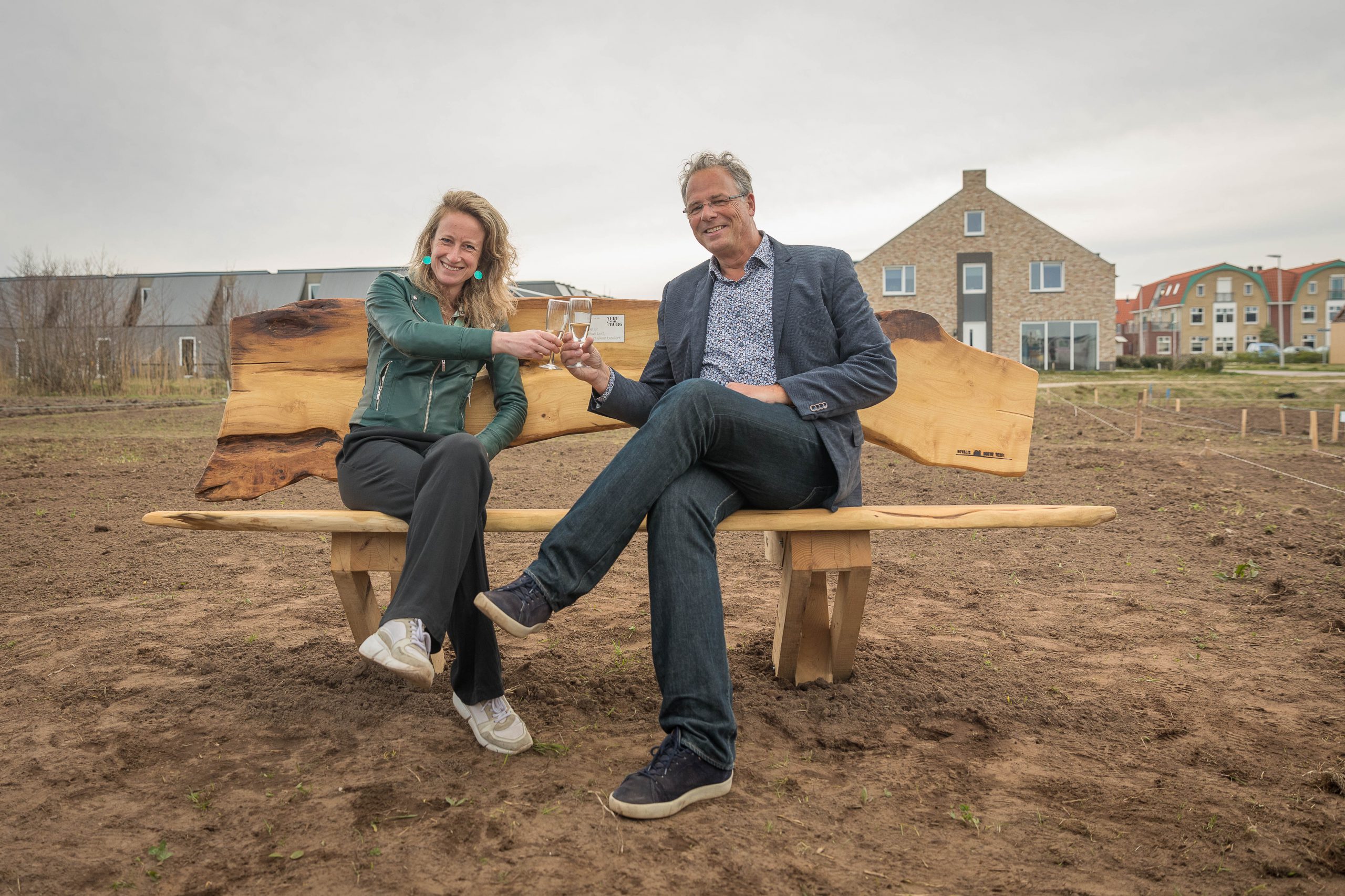 Een feestelijk moment in de ontwikkeling van ‘t Erf van Burg. De uitgestelde viering van de start van de bouw van 17 duurzame woningen in buurtschap De Tuunen. Niet met het leggen van een eerste steen, maar met de onthulling van een bankje. Een bankje dat symbool staat voor waar de initiatiefnemers KRKTR en Beyond Now samen met de bewoners en de gemeente voor staan. Een bankje dat niet voor niets de tekst draagt “Het maakt niet uit wat je van elkaar bent, maar wat je voor elkaar betekent.” Dat past ook bij de opzet van Buurtschap de Tuunen. Daar gaat het niet alleen over duurzaamheid in technische zin, maar ook over betrokkenheid en gemeenschapszin.
